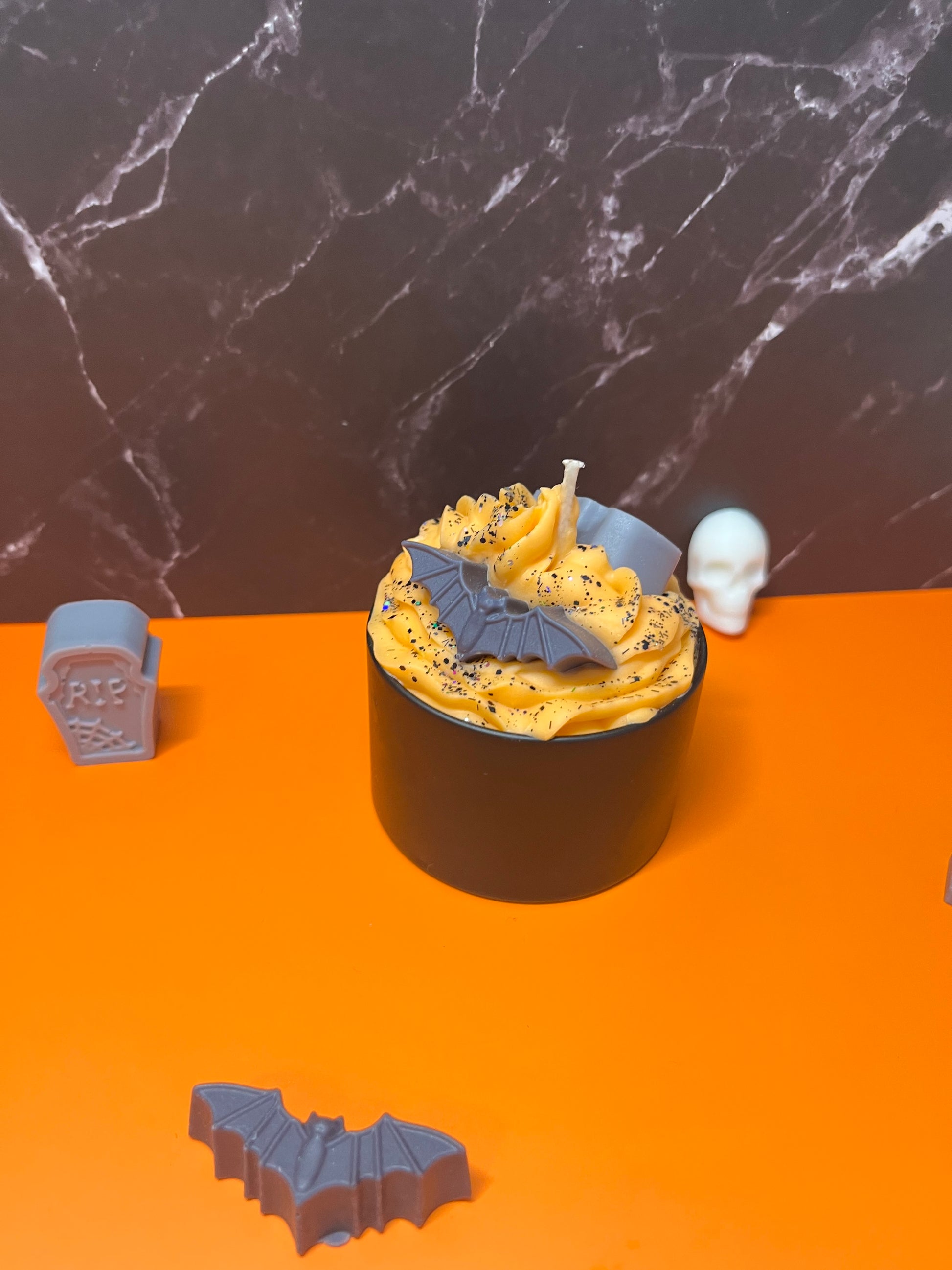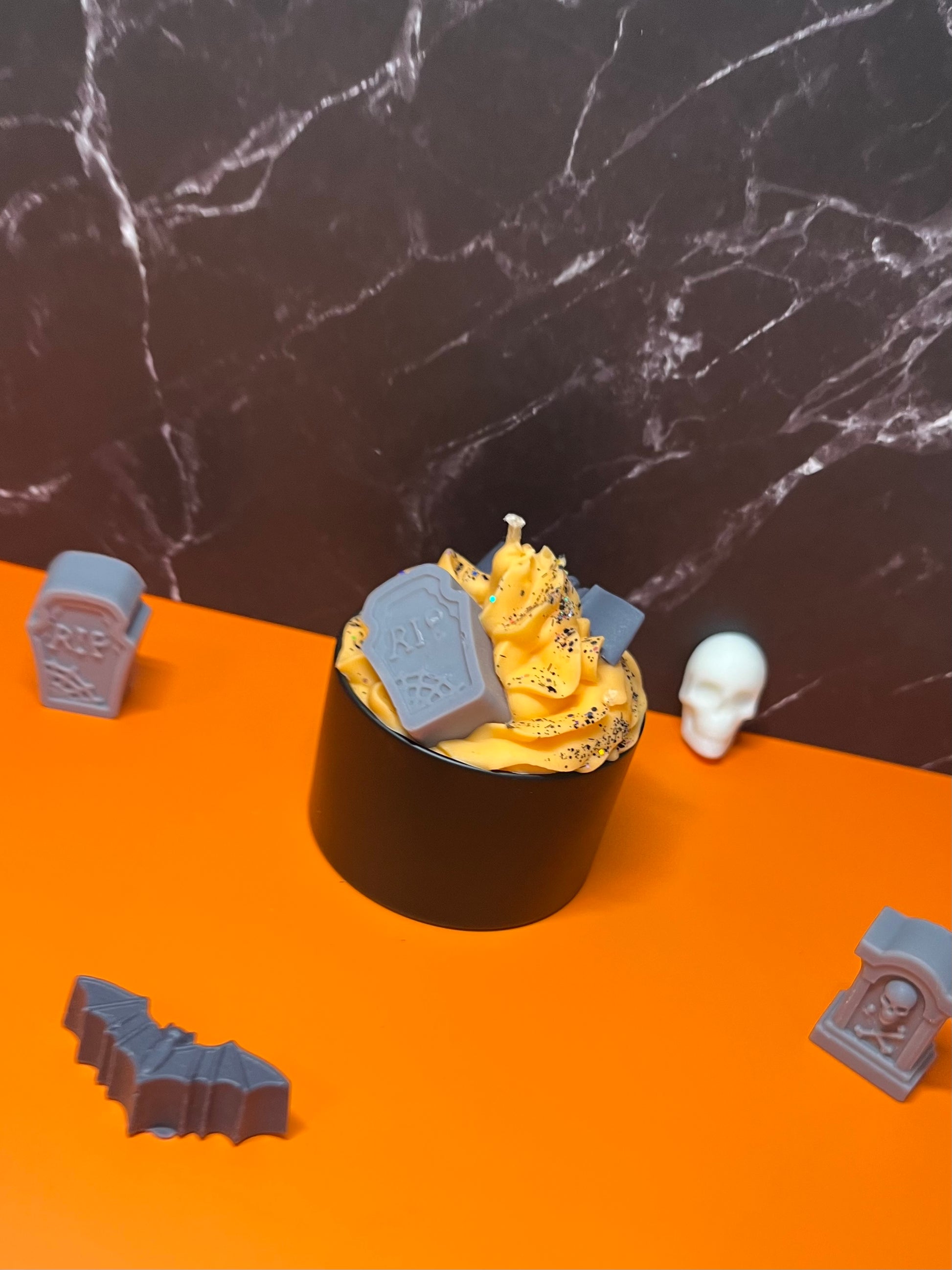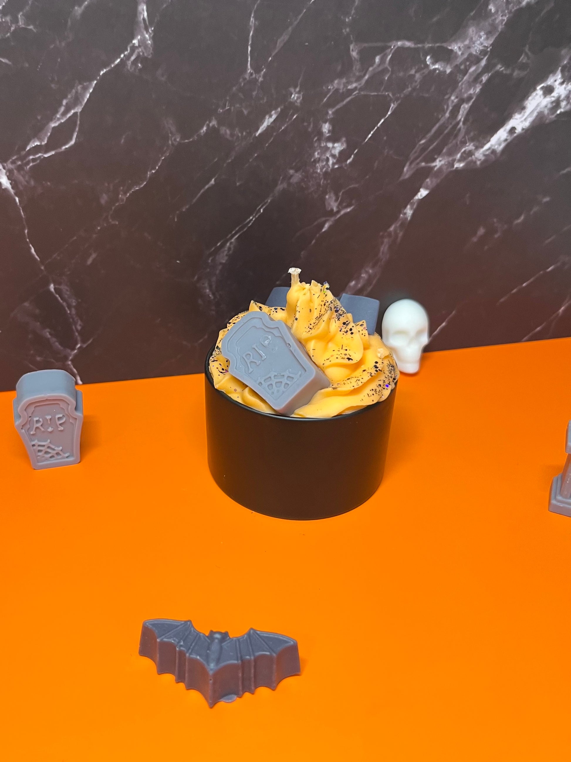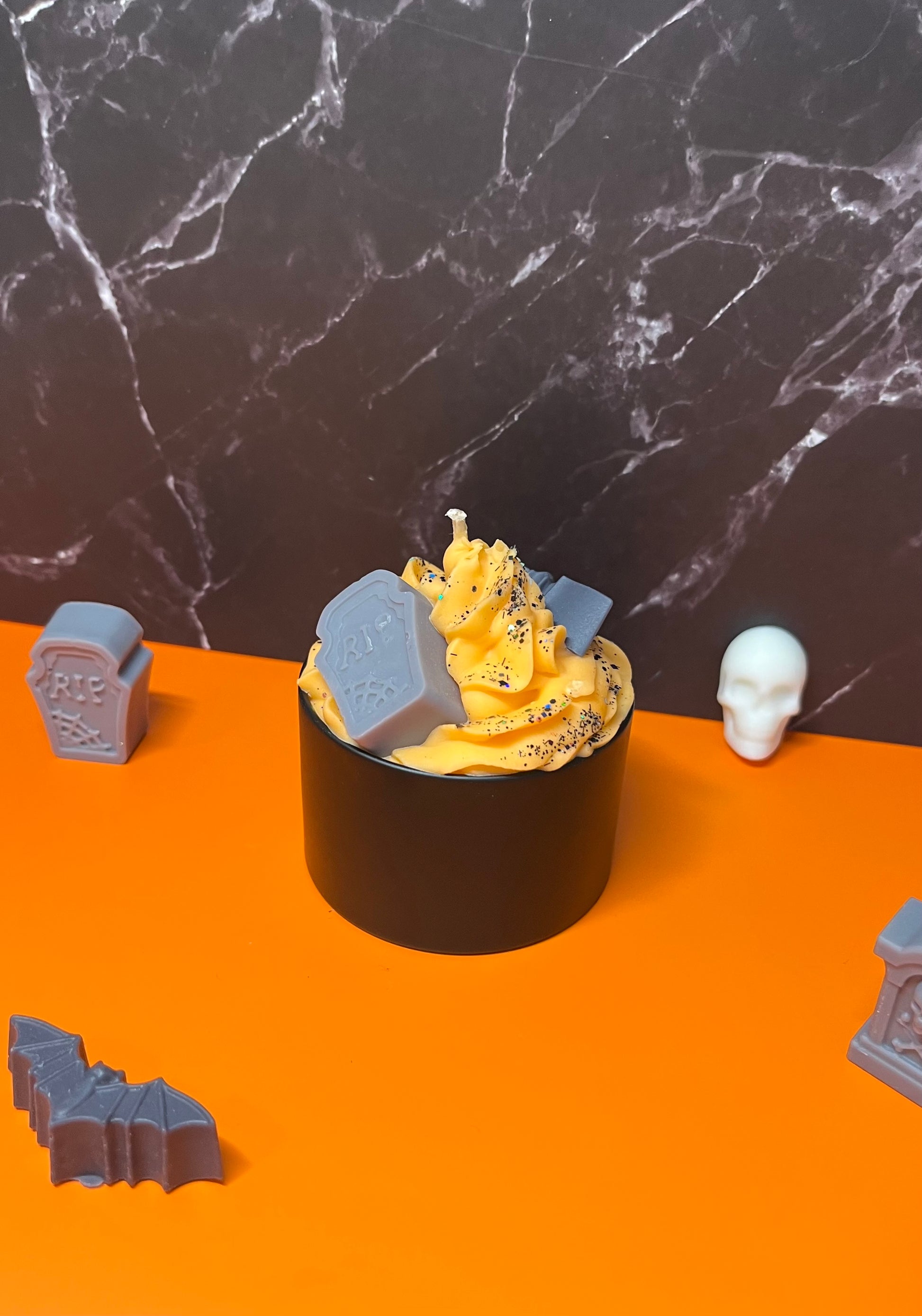 Diese liebevoll gestaltete Halloween-Kerze vereint verspieltes Design mit gemütlichem Duft. Mit ihrer cremig-orangenen Wachstopping, dekoriert mit einem süßen Fledermaus-Element, einem Grabstein und schwarzem Glitzer, ist sie ein echter Hingucker in deiner Herbst- und Halloween-Deko. Der Duft Sweater Weather bringt eine frische, kühle Brise von einem herbstlichen Tag und warmer Würze in dein Zuhause – wie ein Spaziergang an einem klaren Herbstabend, eingekuschelt in deinen Lieblingspullover. 🍂✨