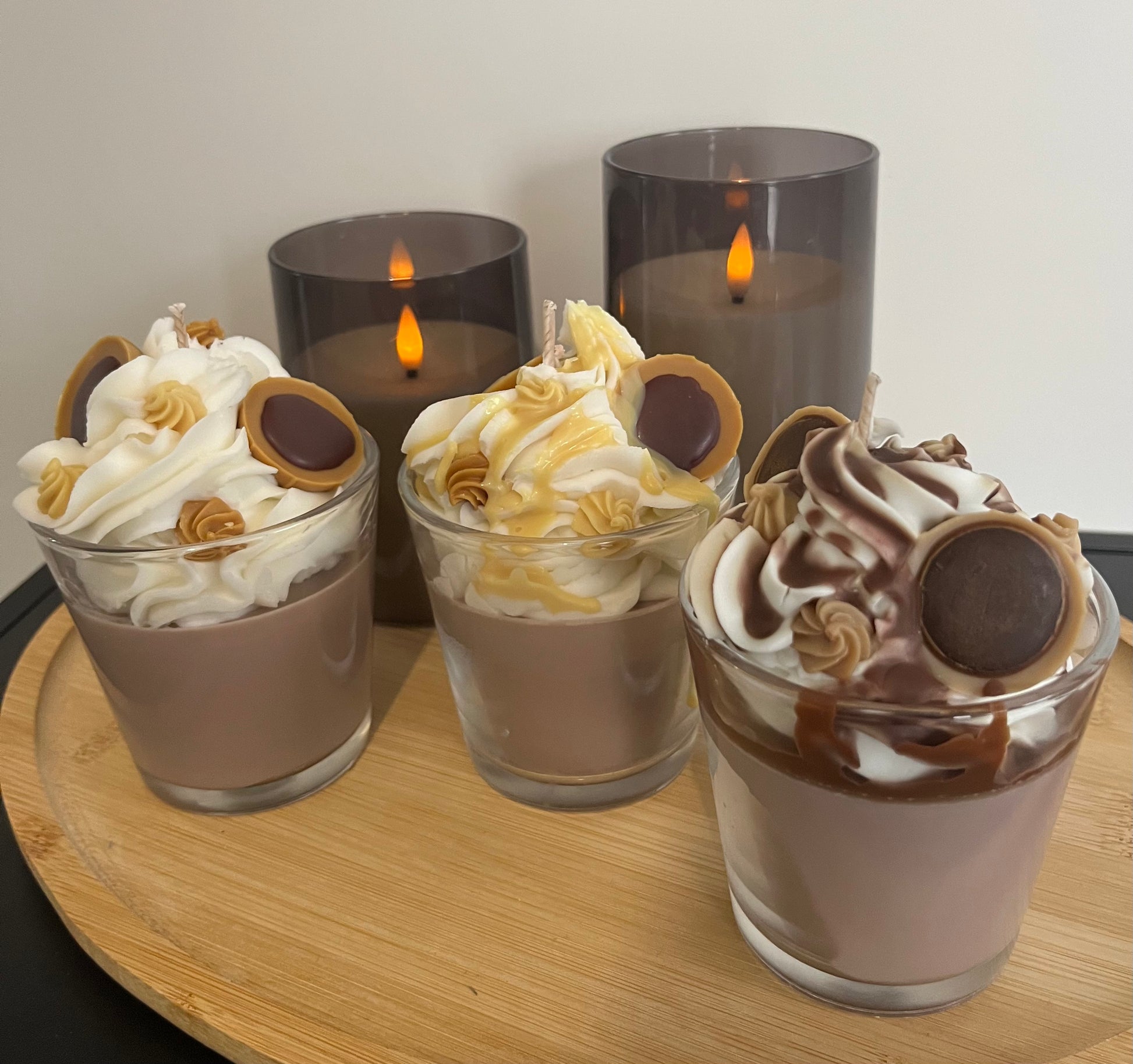 Die Dessert Kerze Toffee Traum erinnert an ein cremiges Sahnedessert, garniert mit Toffee Stückchen und Karamell Drizzle. 🍮